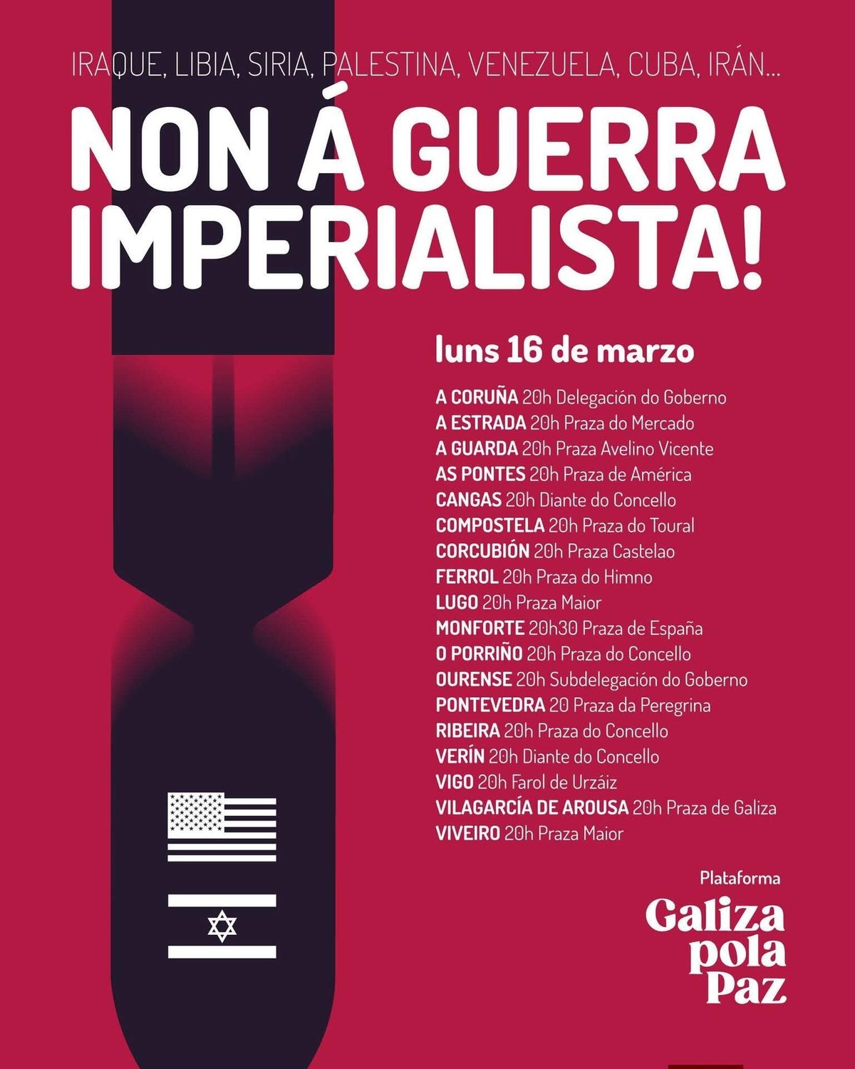 Este luns, 16 de marzo ás 20 h. na Subdelegación do Goberno concentración contra a guerra imperialista. Organiza: Galiza pola Paz